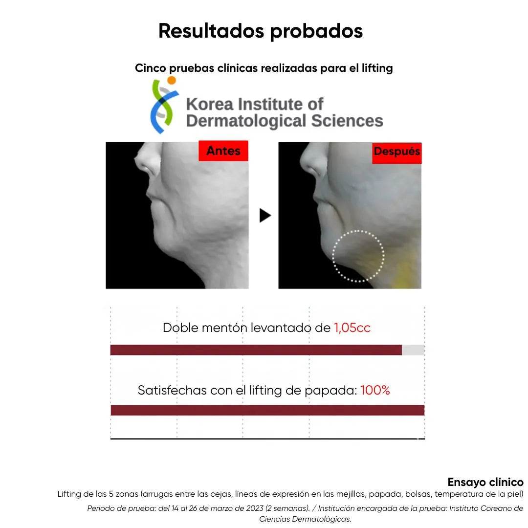 Suaviza visualmente la papada, redefine el óvalo facial y revitaliza la parte inferior del rostro en 30 minutos, sin agujas ni cirugía.